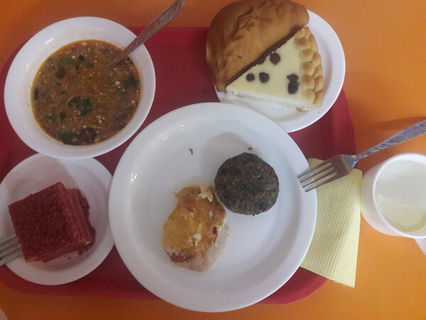 В другой раз я попробовала солянку — оказалась очень наваристой и вкусной, а ещё взяла с собой два пирога. Пироги, особенно с капустой, просто восхитительны. Весь этот набор обошёлся мне всего в 150 рублей.