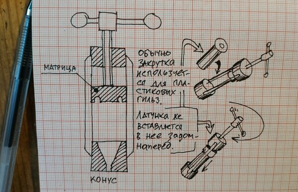 Поскольку мою закрутку я сейчас не нашёл, нарисовал её схематично для наглядности. У большинства таких инструментов с обратной стороны от матрицы есть коническое углубление, обычно используемое для центровки патрона. Мы же будем использовать его наоборот.