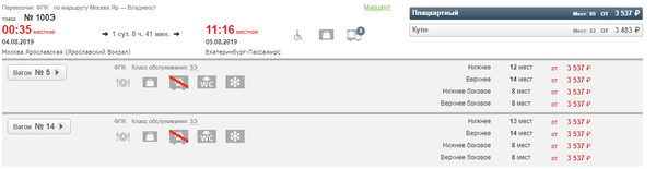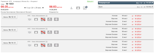 Посмотрите: на 4 августа в поезде Москва – Владивосток на весь маршрут доступны плацкартные вагоны под номерами 12, 13 и 14.