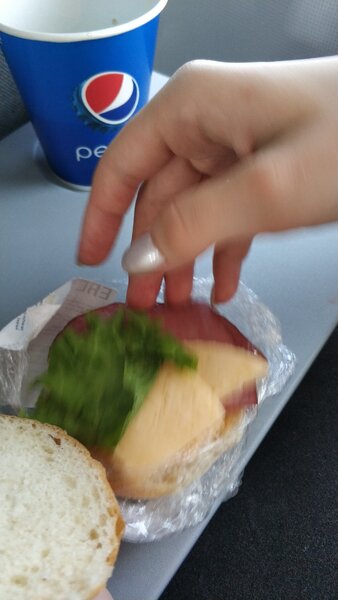 Назвать это полноценным питанием сложно. Пассажирам предлагают сэндвич с курицей за 250 рублей. Поскольку перелёт длился около трёх часов, а я летела с дочерью-подростком, я решила заказать по сэндвичу на каждого. Как выяснилось позже, это было верное решение.