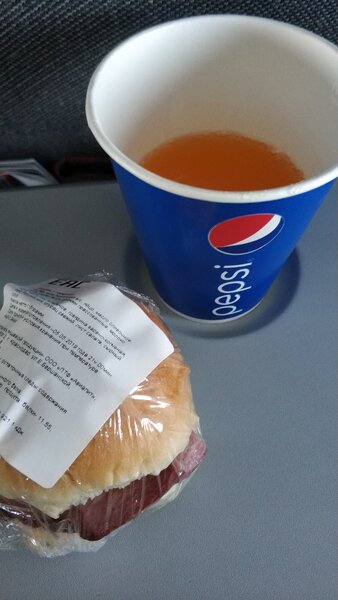 По качеству сэндвич был неплохим: свежие булочки, огурец, сыр, салат и полусолёная курица. Дочка сказала, что вкусно. Но размер… Он был примерно в два раза меньше, чем сэндвичи, которые предлагают «Уральские авиалинии» или «Аэрофлот».