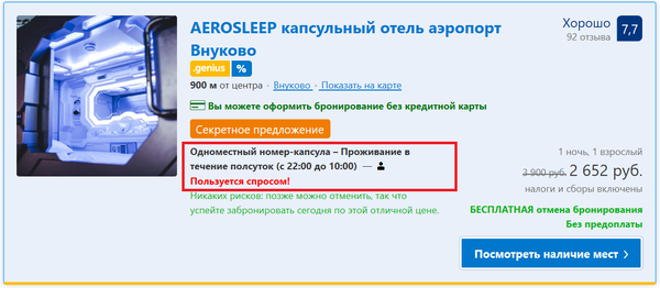 Если бронировать заранее, стоимость составляет 2652 рубля за 12 часов. Для длительного проживания я бы не рекомендовала — за эти деньги можно снять полноценные апартаменты недалеко от Внуково.