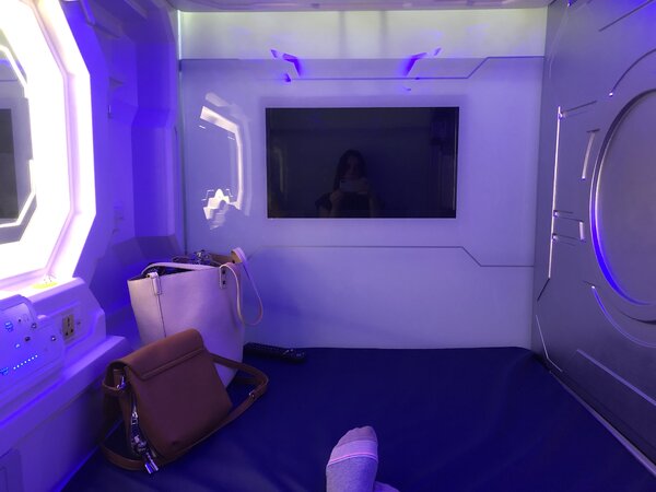 В капсуле можно смотреть телевизор, слушать музыку или просто спать. Я планировала поспать, но у меня это не получилось. В аэропорту, понятное дело, постоянно что-то объявляют по громкой связи, а звукоизоляции в капсуле практически нет. Это, на мой взгляд, самый серьёзный минус. Есть наушники, плюс у меня были с собой беруши, но даже это не спасает.