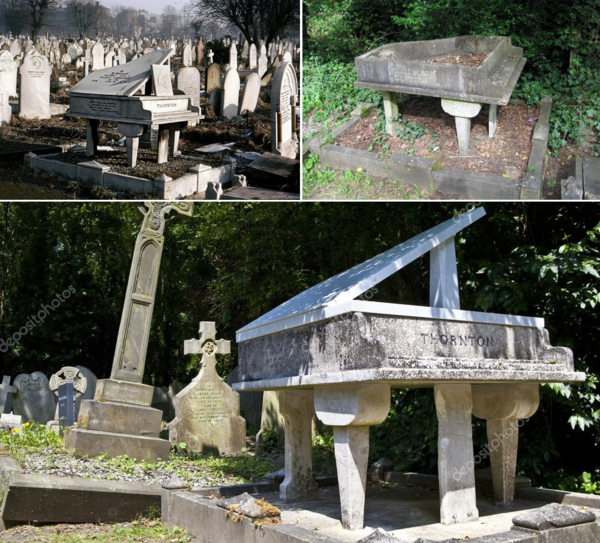 Могила пианиста и певца Уильяма Генри "Гарри" Торнтона — крышка рояля новая, памятник был сильно разрушен и восстановлен не до конца