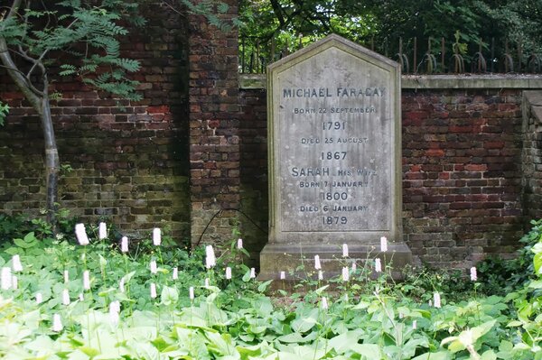 Могила физика Майкла Фарадея находится у стены — он не был христианином и похоронен на неосвящённой земле