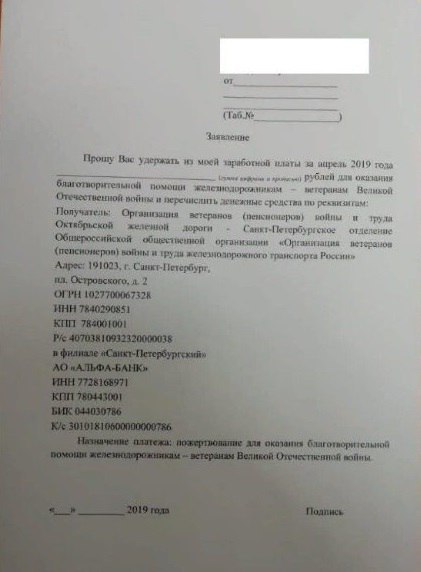 В РЖД уже не первый год практикуется сбор денежных средств с сотрудников в пользу некоего фонда помощи ветеранам. Год назад эта история вызвала общественный резонанс, но, как выяснилось, уроков из неё не извлекли — в текущем году ситуация повторилась практически в том же формате.