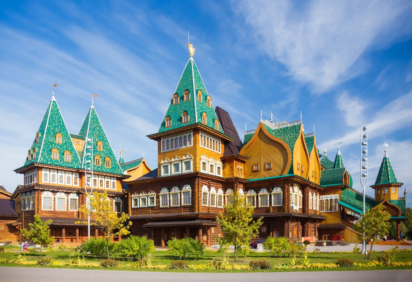 2. Коломенское. Деревянный дворец Алексея Михайловича, конечно, современная реконструкция, но выполнена она по старинным чертежам. Его нарядный, почти фантазийный облик настолько ярок, что сложно поверить, будто именно так он выглядел в XVII веке. Однако сегодня это здание радует глаз буйством красок и затейливыми формами. Кроме дворца, в Коломенском есть ещё и церковь Вознесения Господня XVI века — невероятной красоты памятник архитектуры.