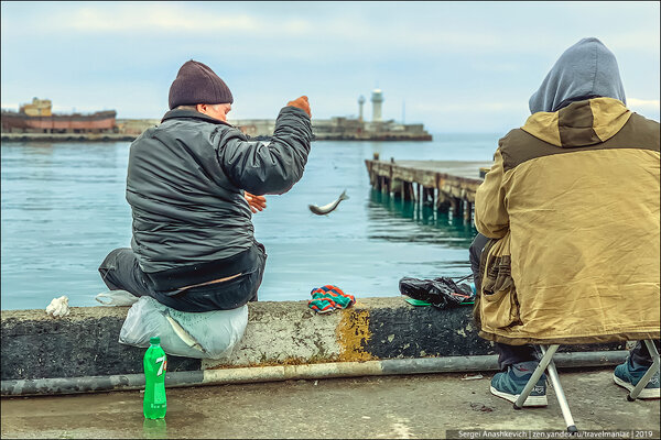 Классическая ялтинская картина: рыбаки на набережной. Седовласый мужчина слева, как рассказывают, сидит на этом месте с тех пор, как был мальчишкой и приходил сюда с отцом.