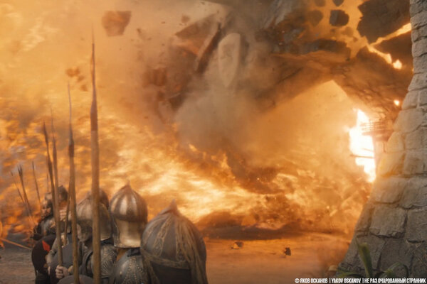 К способностям дракона у меня тоже возникли вопросы. С одной стороны, мы видим, как струя его пламени сносит каменные башни и укрепления с мощью, сравнимой с артиллерийским залпом или даже ударом баллистической ракеты. На первом изображении в посте отчётливо видно, как целая башня рушится от одного «плевка».
