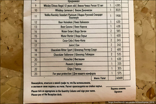 Ну а общая сумма, в которую выливается всё содержимое этого мини-бара — напитки, шоколадки, орешки — просто приятно радует глаз своей круглостью: 42 000 рублей.