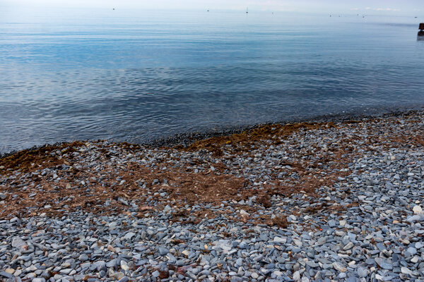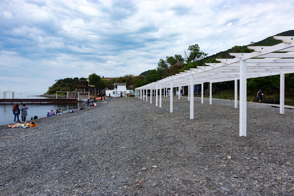 Пляж здесь небольшой, галечный и, к сожалению, довольно грязный. Водоросли, выброшенные на берег, так и лежат, их никто не убирает. Правда, кафе на пляже потихоньку готовятся к приему гостей.