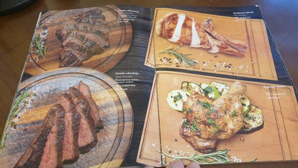Супы — от 200 рублей, бургеры — около 300, стейки — меньше тысячи. Всё выглядит замечательно.