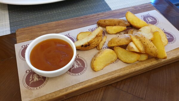 А теперь самое главное. Эта одна картофелина обошлась нам в 99 рублей, а крошечная порция фабричного соуса — почти в 70.