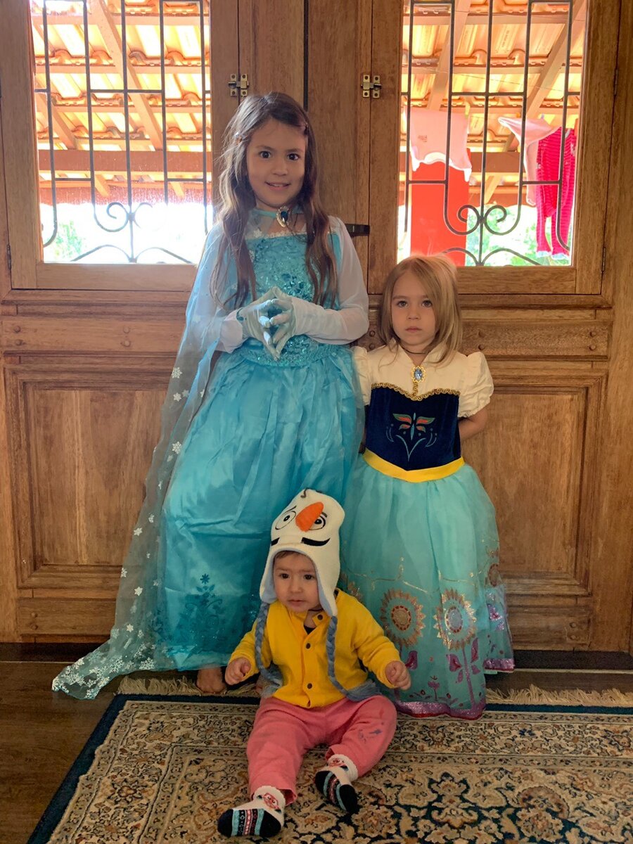 Одежду для девочек я заказывала сама на Amazon с доставкой прямо в отель к мужу. В этот раз у него была очень насыщенная поездка, и времени на шопинг не оставалось. Выбрала им платья Эльзы и Анны — наденем на новогоднюю елку в России. А для Катюши муж нашел очаровательный костюм снеговика Олафа.