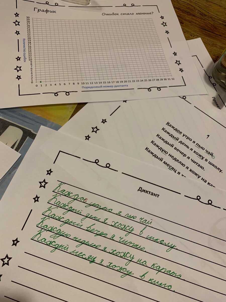 2. Каждый день пишем диктанты по отличному пособию Даши Куматренко. Работаем так: Валюша сначала читает текст и отмечает все сложные места, орфограммы и знаки препинания. Потом я диктую, она пишет. Проверяем, считаем ошибки. Разбираем их, выписываем слова с непроверяемыми орфограммами. На следующий день повторяем тот же диктант, снова считаем ошибки и отмечаем прогресс на графике. Количество ошибок постепенно уменьшается, ребенок наглядно видит свои успехи и радуется.