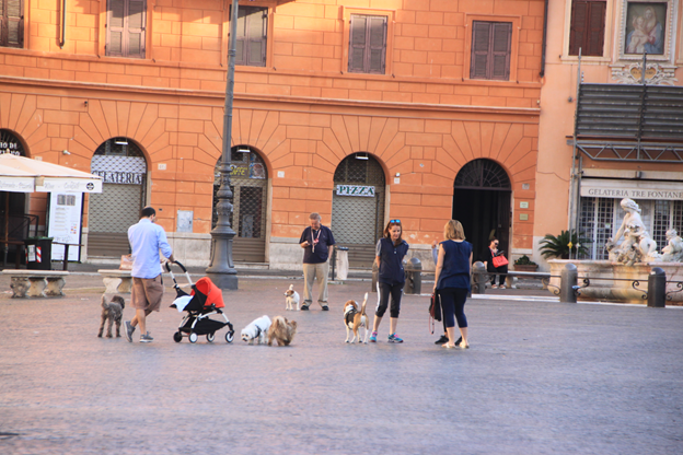 Для выгула есть специальные парки, но в Риме, например, по утрам на пьяцца Навона стихийно собирается целое собачье сообщество. Животные резвятся без поводков, а их хозяева обсуждают последние новости.