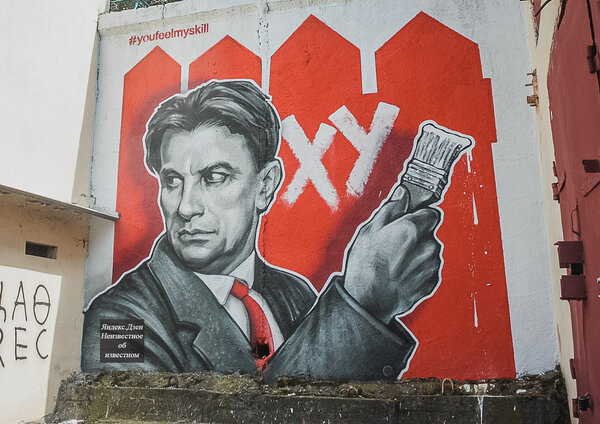 На нём изображён поэт-футурист Владимир Маяковский, выводящий на заборе слово «Ху». Авторы подчёркивают, что здесь нет ничего нецензурного — это отсылка к автографу-псевдониму, который сам Маяковский использовал как хулиганскую подпись. Хотя некоторые зрители, конечно, уже пошутили про хромосомы.