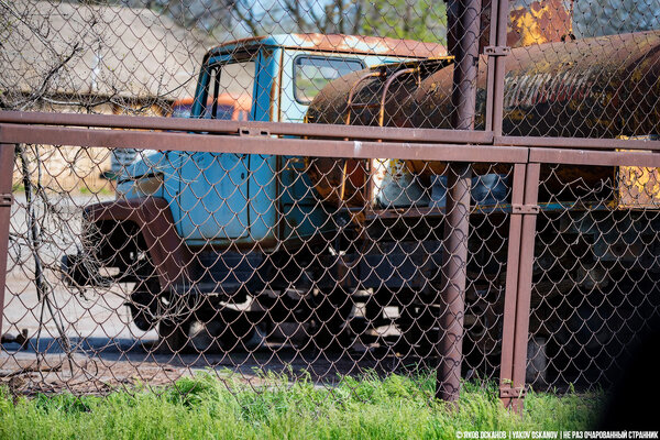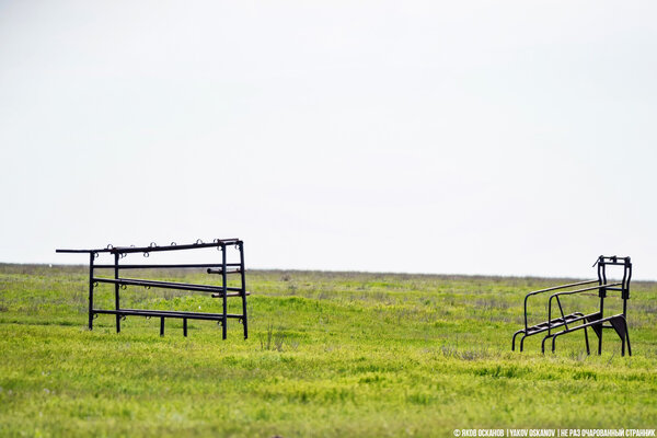 Ещё более сюрреалистичное зрелище — детская площадка с видом на зелёную степную бесконечность. Сложно сказать, когда последний раз детская рука касалась этих качелей и горок. Краска давно сошла, оставив металл на милость дождям и ветру.
