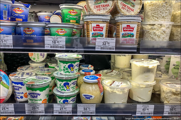 Сметана — от 15 грн (32 руб) за небольшую упаковку 200 граммов 15% жирности до 31,78 грн (78 руб) за крупный стакан 21% жирности.
