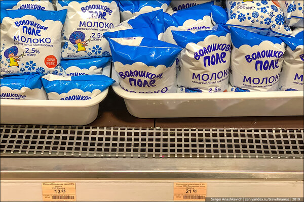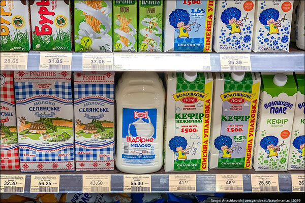 Молоко длительного хранения — от 25 до 43 грн за литр (60-103 руб), кефир — в районе 22-26 грн/литр (52-62 руб).