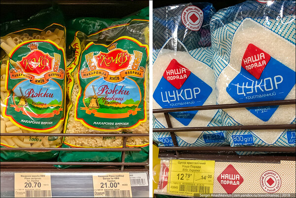 Недорогие макароны местного производства — 21 грн за упаковку (50 руб), сахар — 12,79 грн/кг (31 руб).