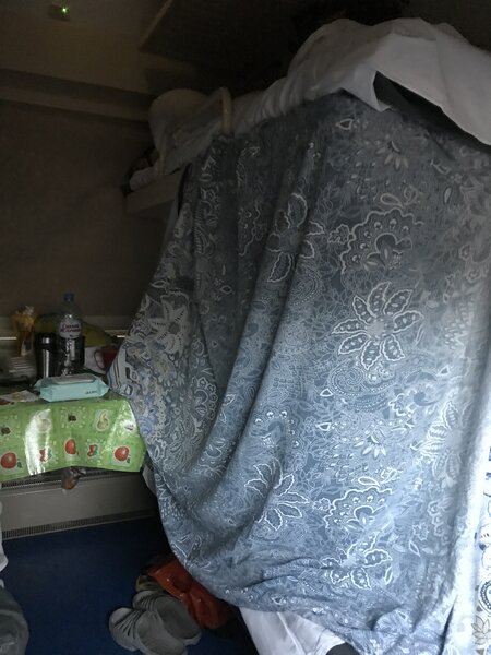 На ночь мама семейства соорудила себе импровизированную занавеску, за которой и переодевалась, и спала. Очень практичное решение! Я бы сама до такого не додумалась.
