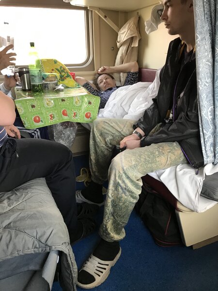 Я ехала рядом с ними около суток, и они постоянно были чем-то заняты. В окно особенно не смотрели — дорога, видимо, знакомая, да и времени не было. Однако они прекрасно знали расписание: за ним следил сын, оно было сохранено у него в телефоне. На продолжительных стоянках они выходили прогуляться.