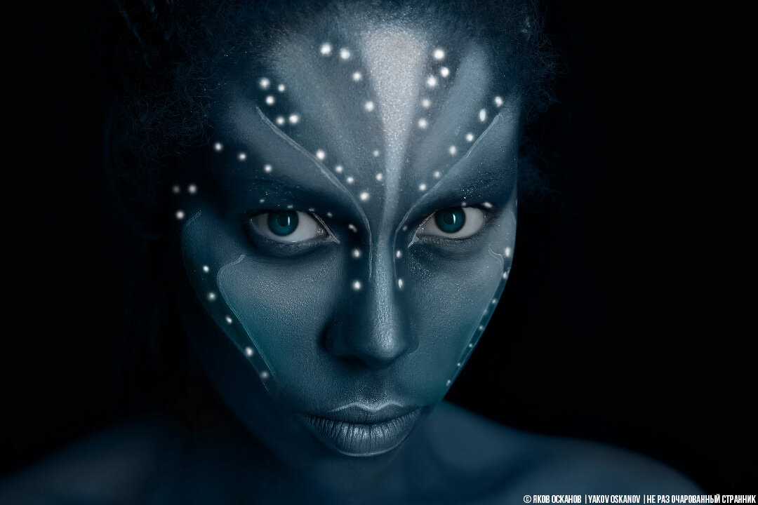 Вторым этапом был грим. Но у меня был опытный гримёр – Наталья, которая согласилась реализовать мои замыслы: перекрасить Тоню в синий цвет "а ля Аватар" и нанести на лицо стилизацию племенного орнамента, и белых светящихся "родинок", типа как были у на'ви.