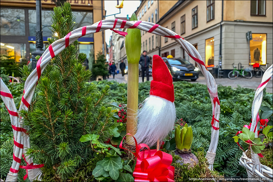 Отчасти так и есть: улицы Стокгольма украшены довольно скудно, а многие люди максимум из того, чем украшают свое жилище — венком из еловых веток на двери и … тем самым гномиком с большой шишкой на подоконнике.