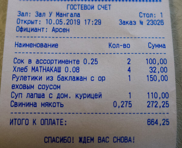 Общая сумма чека составила 664,25 рубля. Как вам кажется, дорого или приемлемо? А сколько в вашем городе стоит 100 грамм шашлыка из свинины? Делитесь в комментариях!