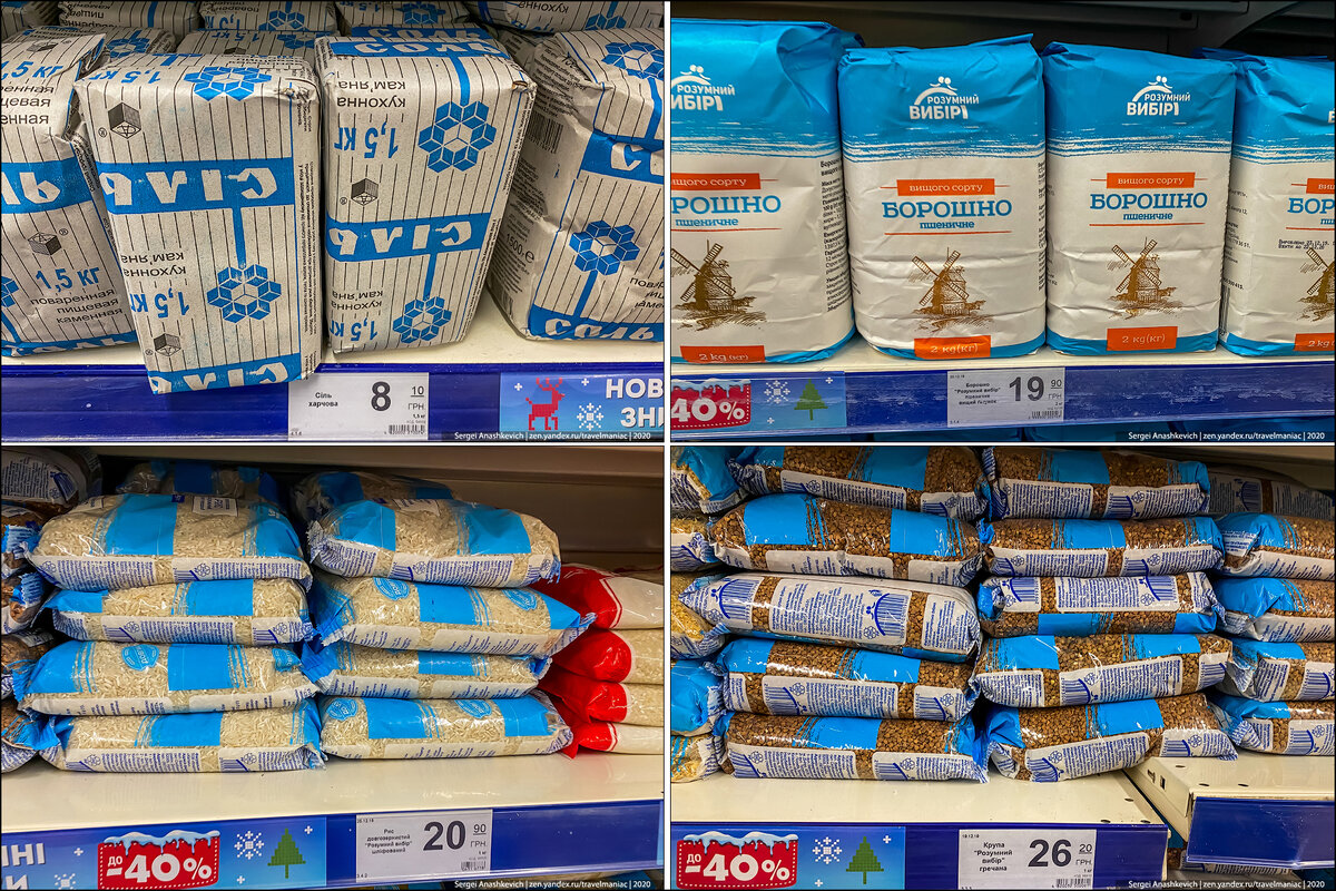 Рис — 20,9 грн за килограмм (54 руб.), гречка — 26 грн (66 руб.), мука — 19,8 грн (51 руб.), большая пачка соли 1,5кг — всего 8,1 грн (20 руб.)