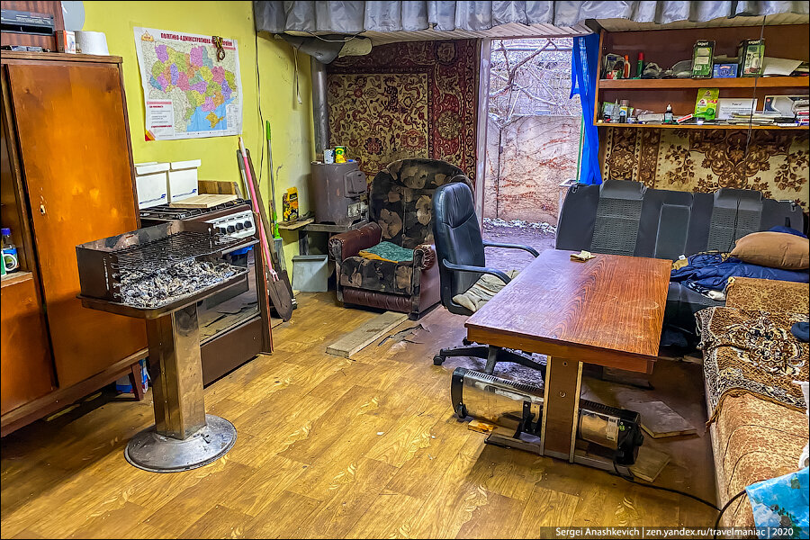 Чтобы не мерзнуть, в углу стояла буржуйка, а под потолком висел инфракрасный обогреватель.