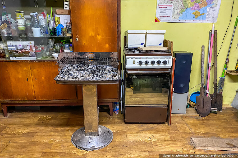 Кухонная зона была оборудована газовой плитой (теперь понятно, зачем нужен был тот баллон), сервантом с посудой и всем необходимым для готовки.