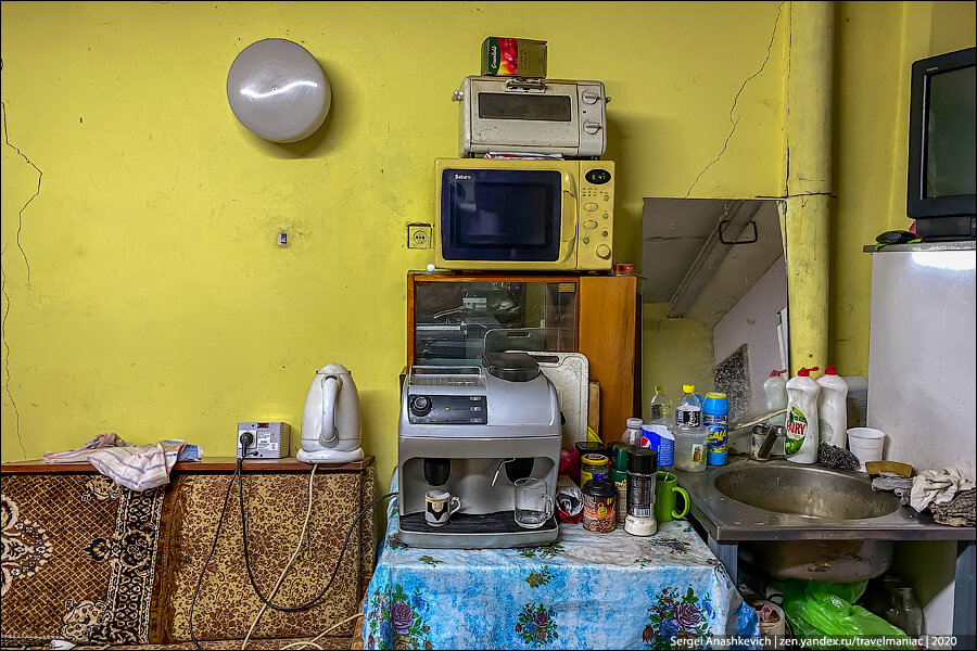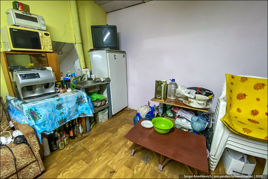 Но самое удивительное ждало дальше: холодильник, телевизор, подведенная вода с проточным нагревателем, микроволновка и даже кофемашина!