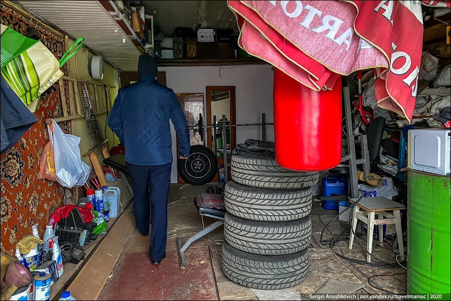 Дима открыл один из таких гаражей, и мы шагнули внутрь. Первое, что я увидел — стандартный набор гаражного хлама: старые покрышки, инструменты, коробки.