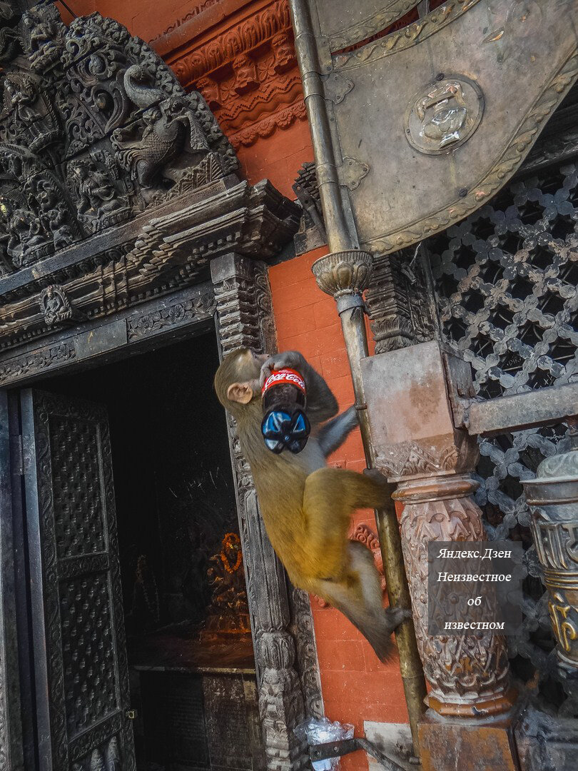 Мне довелось стать свидетелем поучительного инцидента. По дороге в храм Сваямбунатх женщина, шедшая впереди меня, держала в руке бутылку колы. В следующее мгновение на нее с карниза прыгнули сразу две обезьяны. Испугавшись, она начала отмахиваться, и одна из макак вцепилась ей в руку. Бутылка выпала и покатилась по земле. Обезьяна мгновенно прогрызла пластик и принялась лакать сладкую жидкость. Заметив приближение людей, она схватила свою добычу и ускакала наверх, подальше от потенциальных конкурентов.