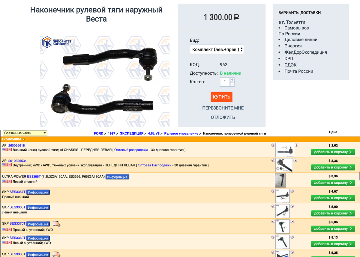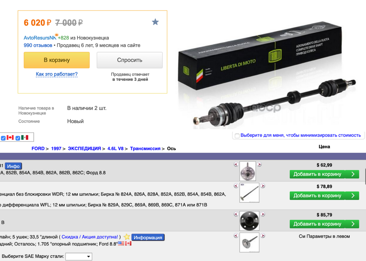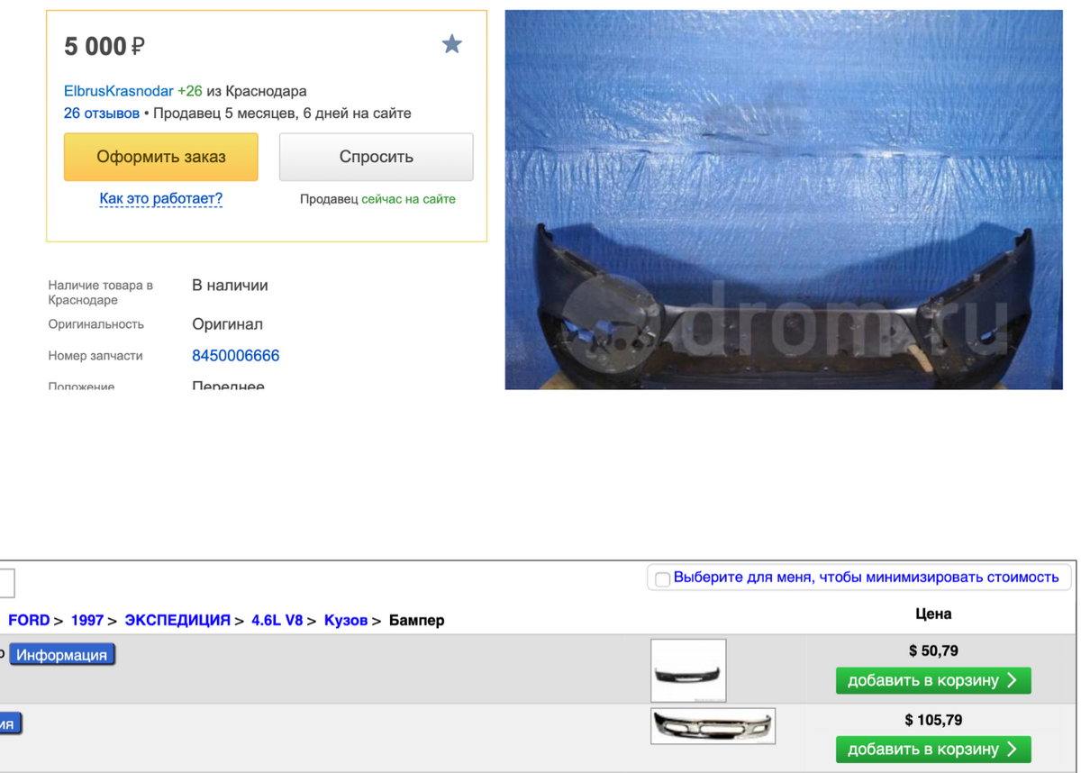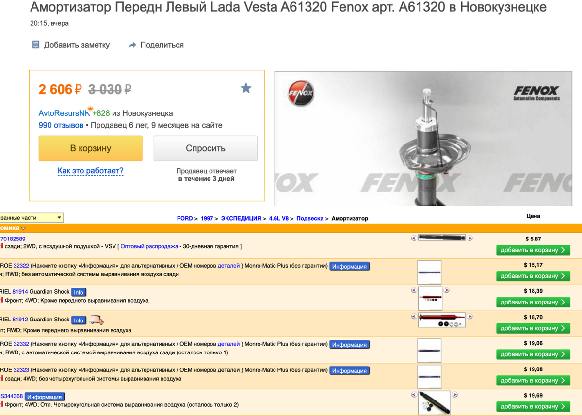 Я не подбирал цены специально — просто вводил названия деталей в поисковик и открывал первые результаты. Цены на запчасти для Форда взяты из централизованной базы, откуда их можно заказать с доставкой в любой регион.