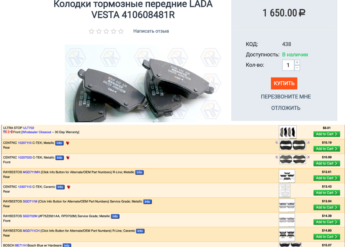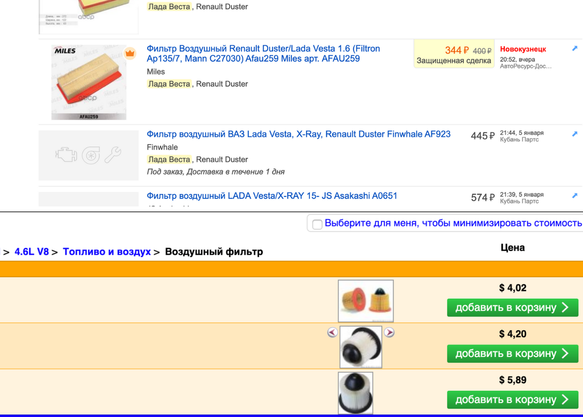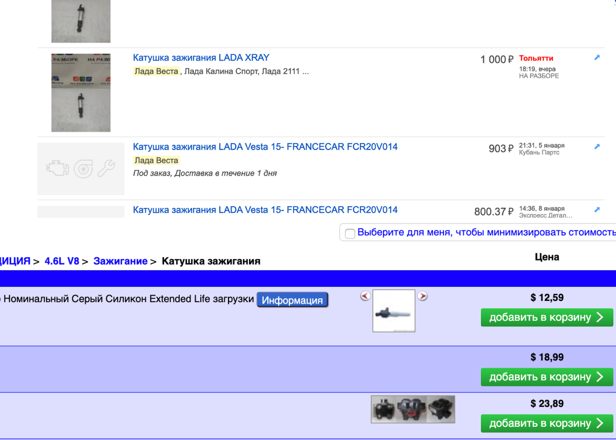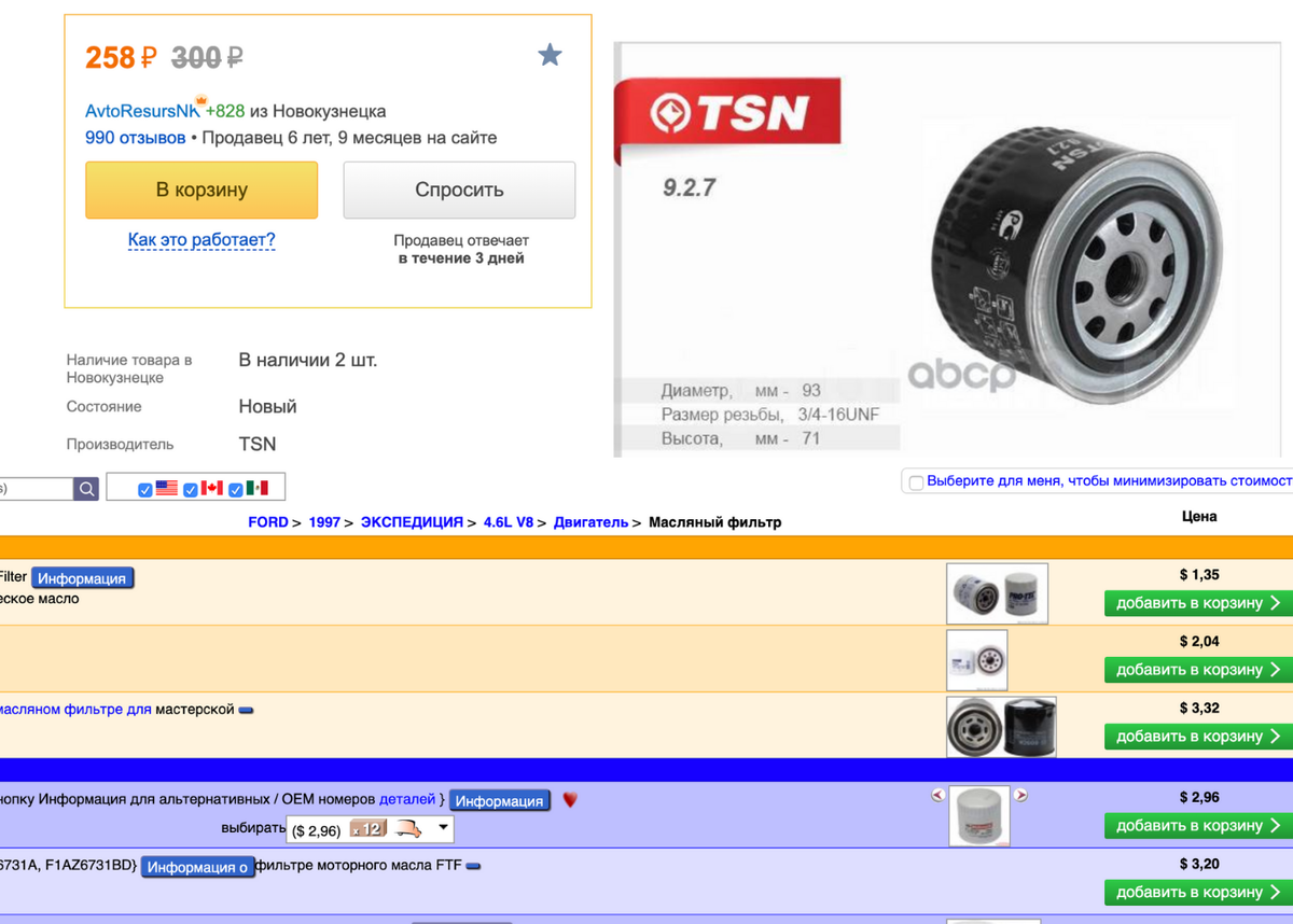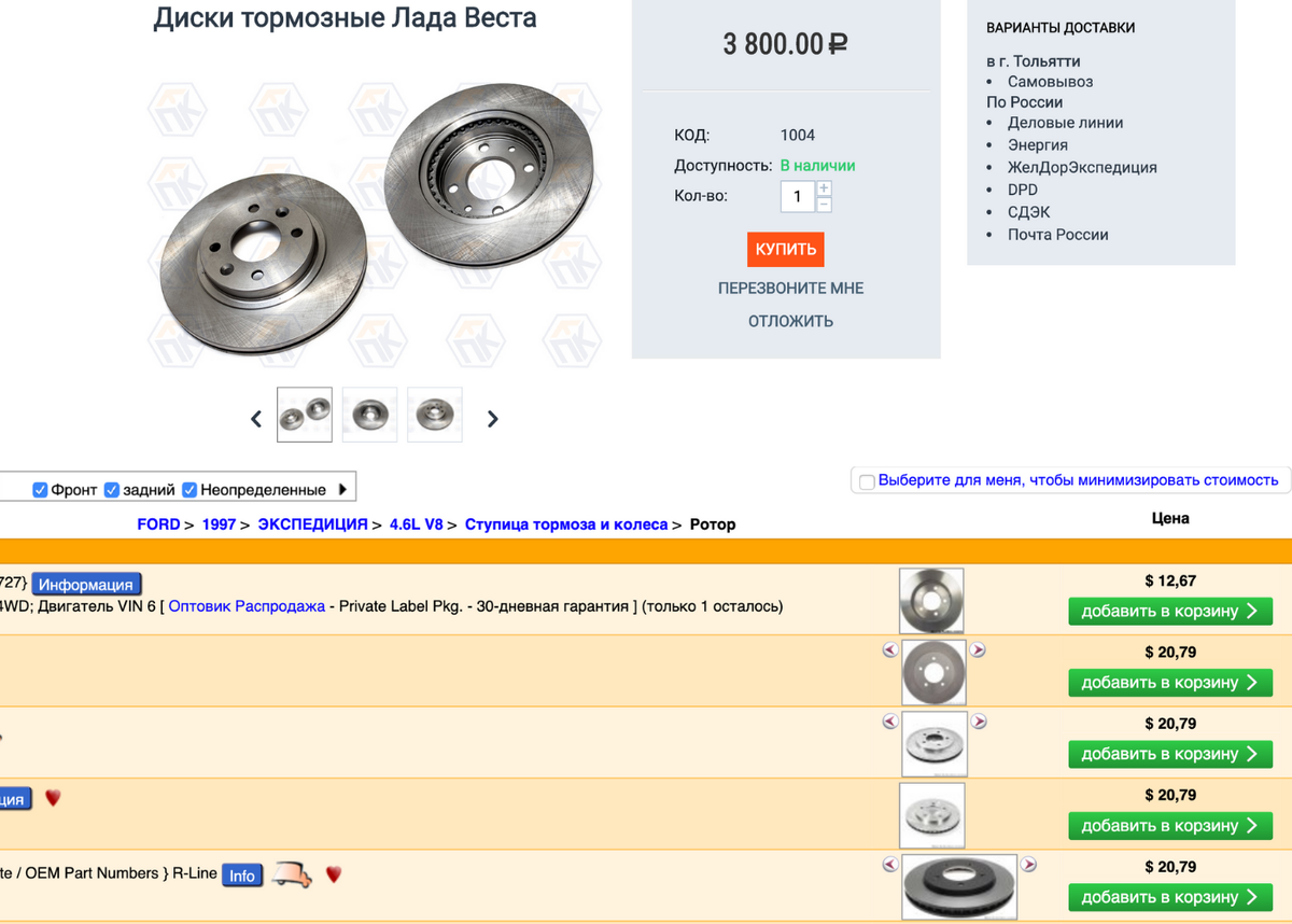 Я не подбирал цены специально — просто вводил названия деталей в поисковик и открывал первые результаты. Цены на запчасти для Форда взяты из централизованной базы, откуда их можно заказать с доставкой в любой регион.