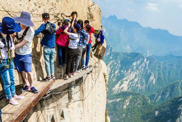 До того как маршрут превратился в популярный аттракцион, восхождение по этой тропе было суровым духовным испытанием, в первую очередь для монахов и верующих паломников. Считалось, что подъём к храму, расположенному на самой вершине, очищает душу и закаляет дух. Неудивительно, что у подножия и в расщелинах Хуашань испокон веков селились даосские монахи, основавшие здесь свои уединённые монастыри.