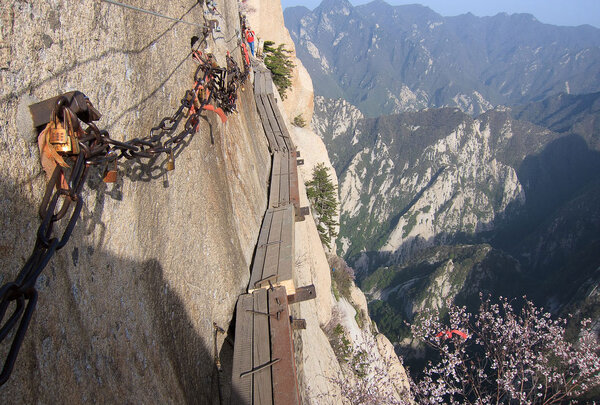 В сердце провинции Шэньси, среди величественных склонов хребта Циньлин, возвышается одна из пяти священных вершин Китая — гора Хуашань. Местные жители говорят о ней с особым почтением: «Побывав здесь, можешь больше не посещать другие горы». С древних времён ходят легенды, что именно в этих уединённых местах обитал великий мудрец Лао-цзы. Пять её пиков, подобно лепесткам, образуют форму божественного лотоса, за что гору часто называют Цветущей. Западная вершина этого комплекса скрывает в себе, пожалуй, самый головокружительный и опасный пеший маршрут на Земле.