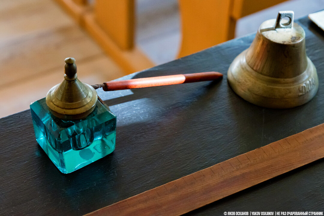 Расположение учительского стола тоже отличается от современного. Он стоит не сбоку, а по центру класса, прямо напротив учеников. А вот классная доска расположена у окна — она не висит на стене, а установлена на специальную треногу.