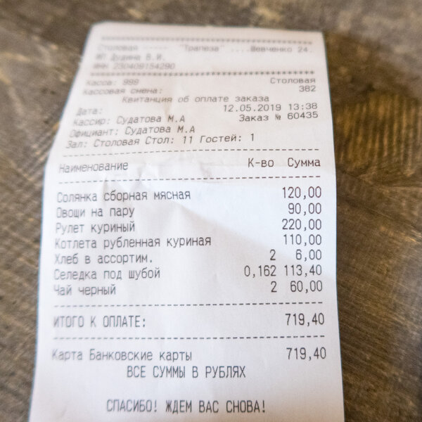 Общая сумма составила 719,40 рубля. Для сравнения, в Анапе нам обычно удавалось уложиться в 500–600 рублей за аналогичный обед.
