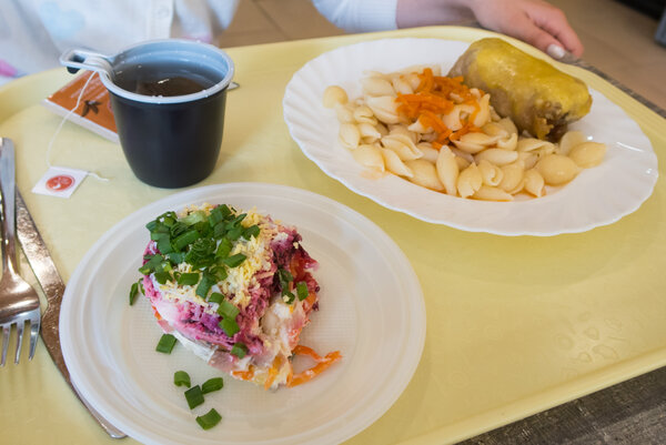 А это обед моей дочери. Только сейчас, разбирая фотографии, я заметила, что нам не посчитали макароны! Получается, фактический счёт должен быть как минимум на 40 рублей больше.