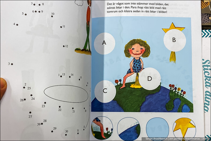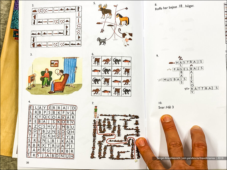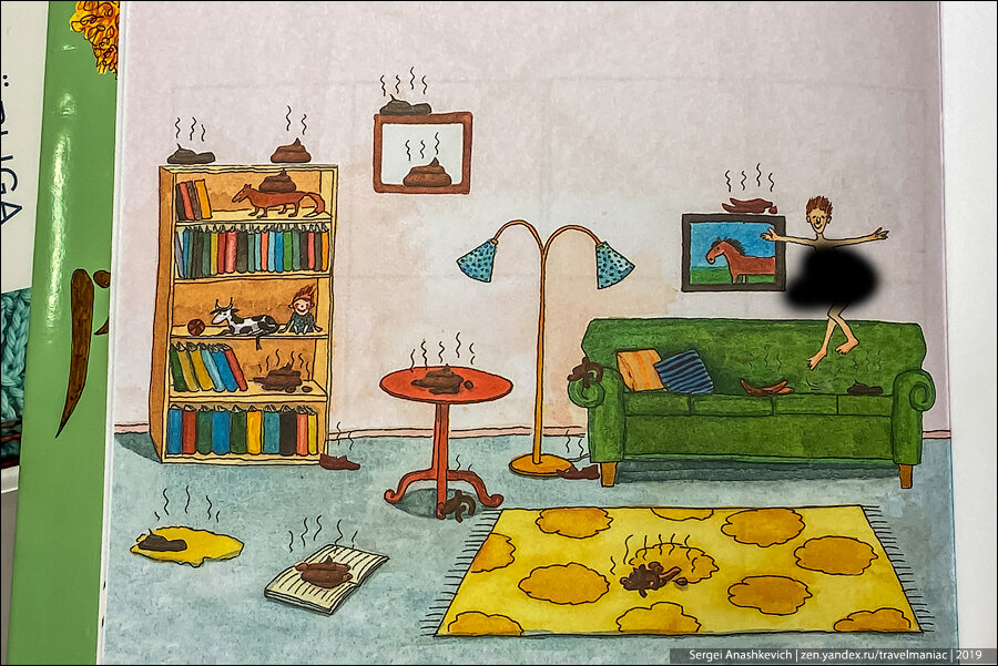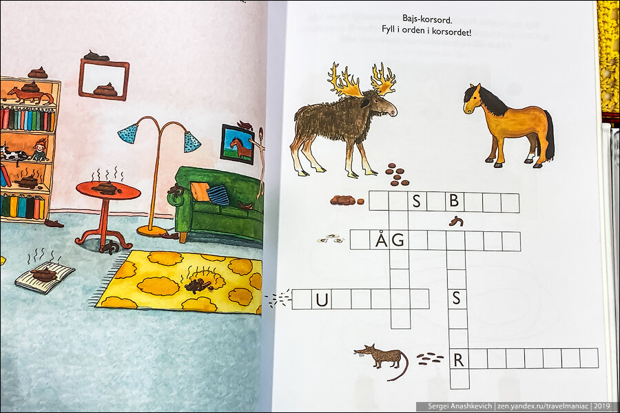 А, это тоже какая-то загадка. Не знаю шведского, не смог разобрать условие, но составитель книжки постарался на славу, рисуя по всей комнате и даже на полках и картине ароматные кучи.