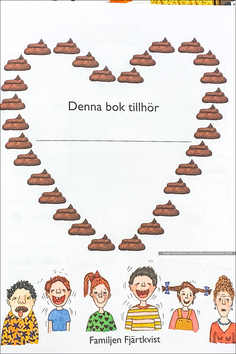 Вот первая страница обучающей книги 6+ из Швеции про какашки и остальные туалетные дела. Сердечко из … ну вы поняли … и радостная семейка Фьярквистов.