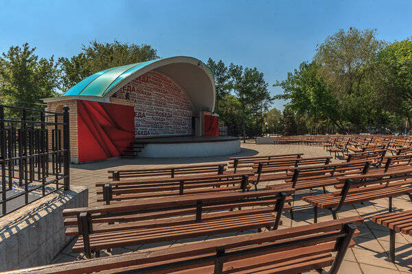 Летняя эстрада выглядит аккуратно, хотя к некоторым элементам оформления у меня есть вопросы. Например, повторяющееся слово «победа» разных размеров — возможно, его можно было бы разбавить другими значимыми понятиями, такими как «честь», «отвага» или «долг», чтобы сделать композицию более выразительной и глубокой.