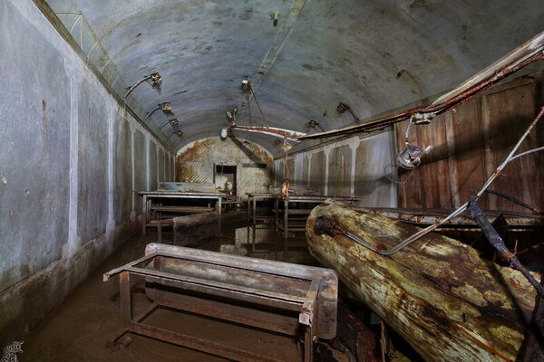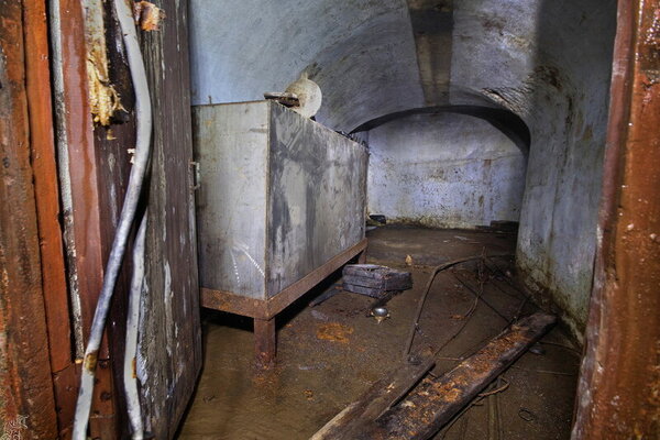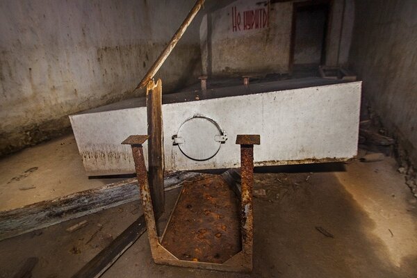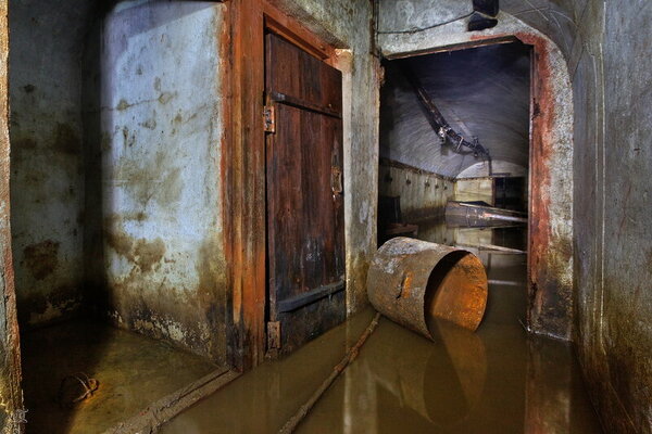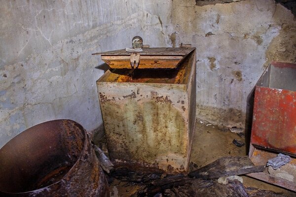 Недалеко от входа на полу лежит ещё один бак для аварийного запаса воды. Судя по всему, его сдвинуло с места и принесло сюда во время одного из подъёмов грунтовых вод.
