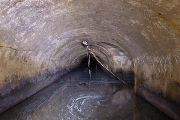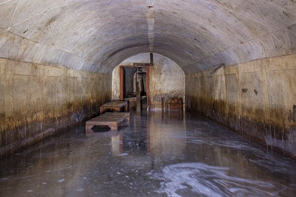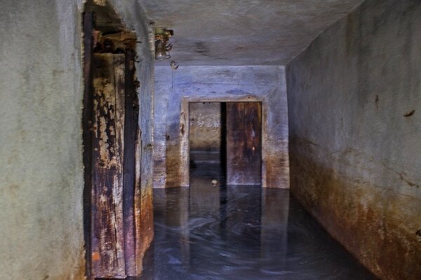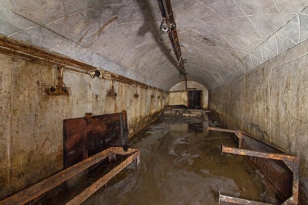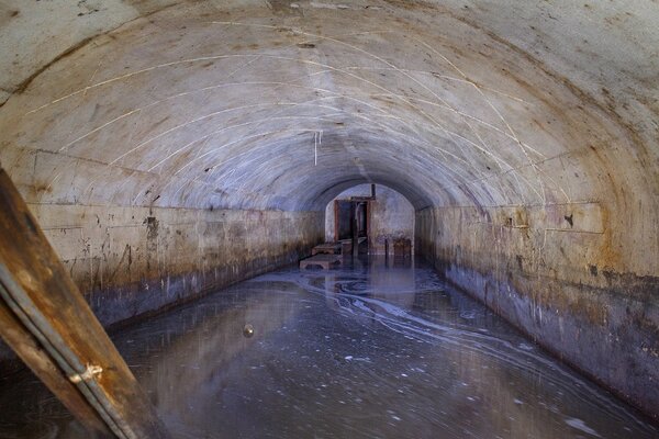 Уклон пола хорошо заметен по уровню стоящей воды в дальнем конце. Впереди видна вторая потерна, которая проходит параллельно главной вдоль торцов всех блоков.