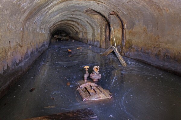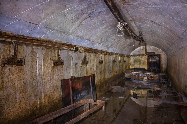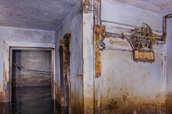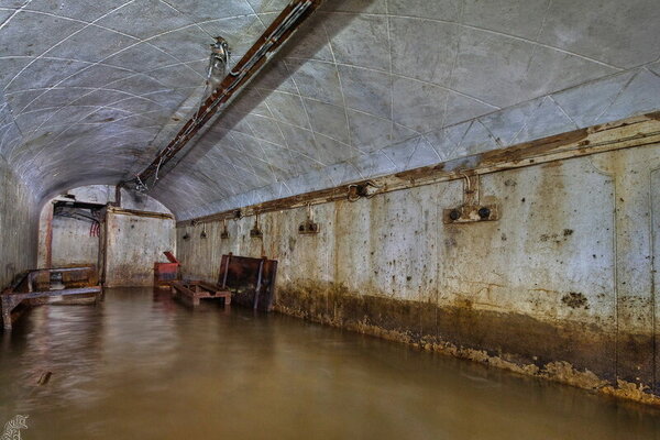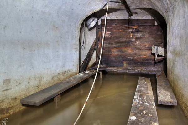 Двигаемся дальше. Уровень воды становится всё выше. Из воды торчит насос для откачки грунтовых вод. Скорее всего, его установили уже после того, как завалило выход в конце потерны. Естественный дренаж нарушился, и вода стала скапливаться внутри.