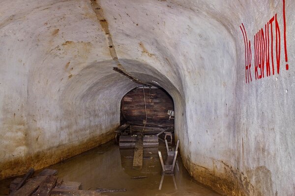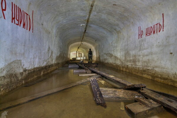 Дальше идти уже невозможно — уровень воды поднимается выше груди. Потерна заканчивается поворотом налево, за которым когда-то был выход у основания сопки, ныне полностью засыпанный. На этом наша экскурсия завершается.